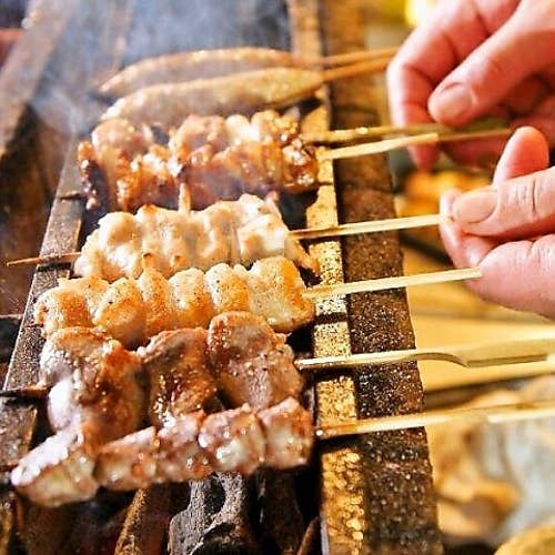 備長炭でじっくり焼き上げる本格焼き鳥は、ひたち鶏やつくば鶏など鮮度抜群の地鶏を使用し、手串で一本一本丁寧に仕込みます。